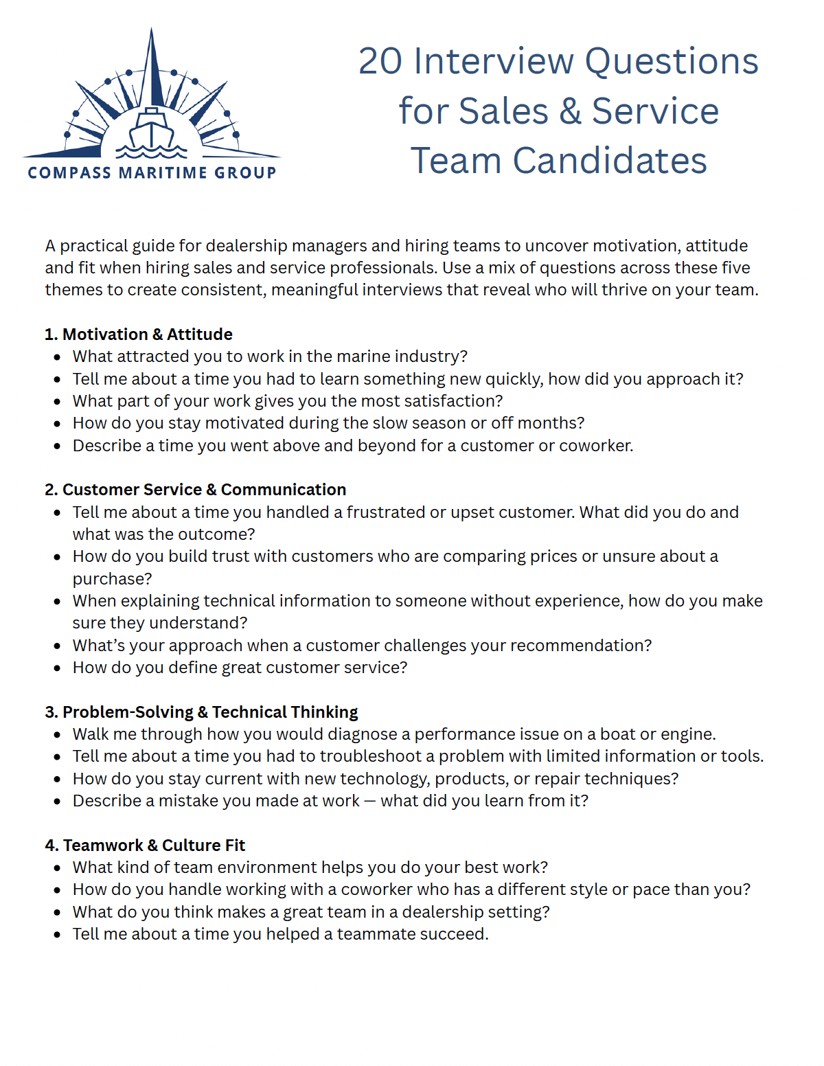 Having meaningful interviews, complete with consistency and direction, can help your dealership hire well the first time. Compass Maritime Group, an MRAA Partner, offers your dealership this practical guide for uncovering motivation, attitude and proper fit when hiring for your sales and service departments. The 20 questions are broken down into five critical areas of focus that will help you reveal who will thrive on your team.