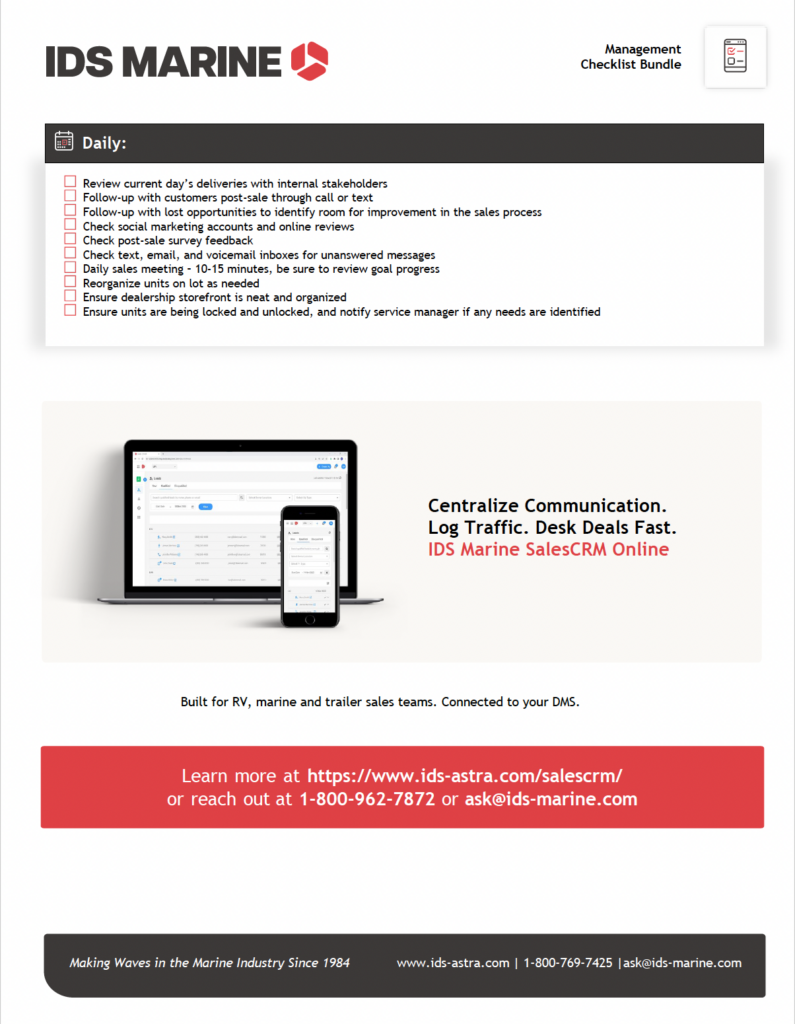 To bring better structure and consistency to your dealership’s sales efforts, use this plug-and-play checklist from IDS Marine. Built for sales managers, it pairs daily accountability with a simple four-week framework that helps standardize goal-setting, lead management, follow-up and showroom readiness. By creating a more buttoned-up, repeatable sales process, your dealership can improve team execution, strengthen post–boat show follow-up and convert more leads by ensuring timely outreach and fewer missed opportunities.